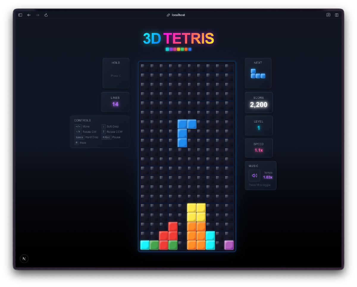 Dieser Tetris-Klon macht wirklich Spaß. Die 3D-Blockgestaltung verleiht ihm Persönlichkeit, das Korobeiniki-Thema lässt ihn authentisch wirken, und das Sound-Design fügt jeder Aktion befriedigendes Feedback hinzu. Die Tatsache, dass das gesamte Audio prozedural aus Oszillatoren und Noise-Buffern generiert wird, ist ehrlich gesagt beeindruckend. In diesem gesamten Projekt gibt es keine Audiodateien.