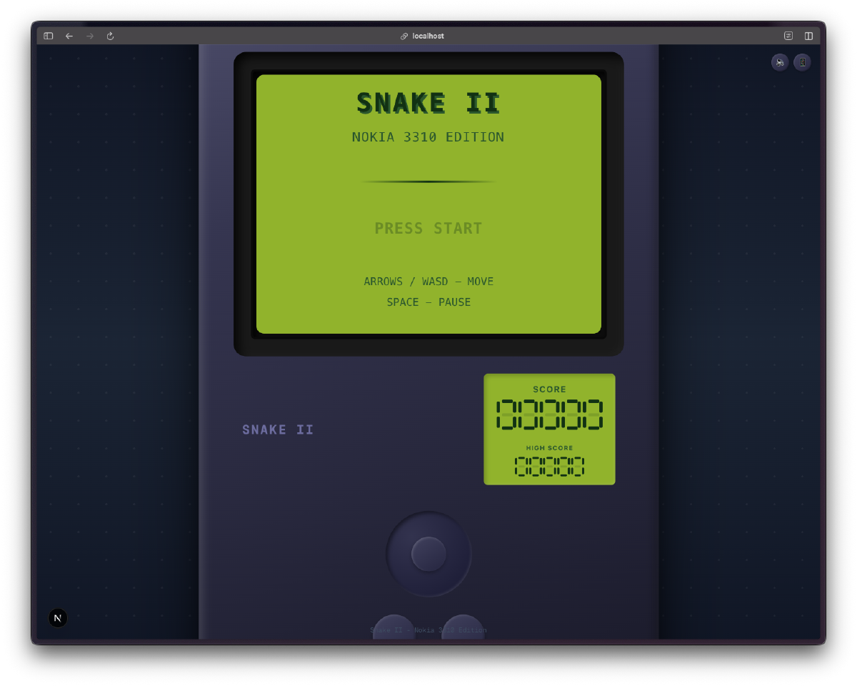 It built an entire phone. Not just a game canvas. A full Nokia 3310 frame with a speaker grille, NOKIA branding, a D-pad, action buttons, and a screen bezel with depth. The phone body has gradients and shadows that make it look three-dimensional. I asked for a phone frame. I got a phone.