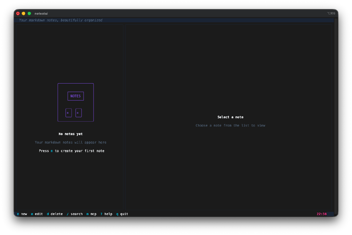 The empty state is friendly. First time you run it you get a clean welcome screen telling you to press n to create your first note. The bottom bar shows all the keybindings at a glance.