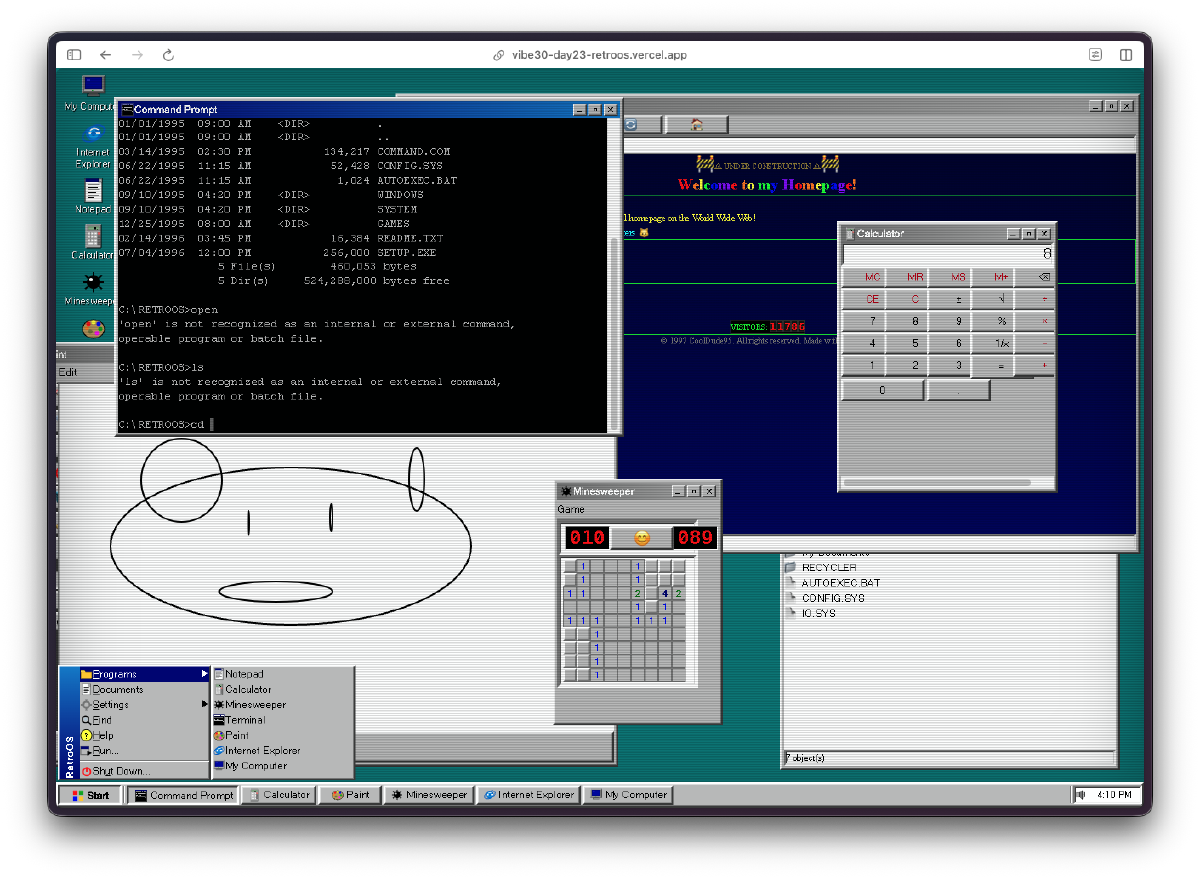 “Build a Windows 95-inspired desktop environment that runs in the browser. Include a taskbar, start menu, draggable and resizable windows, and classic apps like Notepad, Calculator, Paint, Minesweeper, Terminal, Internet Explorer, and My Computer. Add a boot sequence, pixel art SVG icons, sound effects, wallpaper selection, a CRT effect, and a BSOD easter egg.”